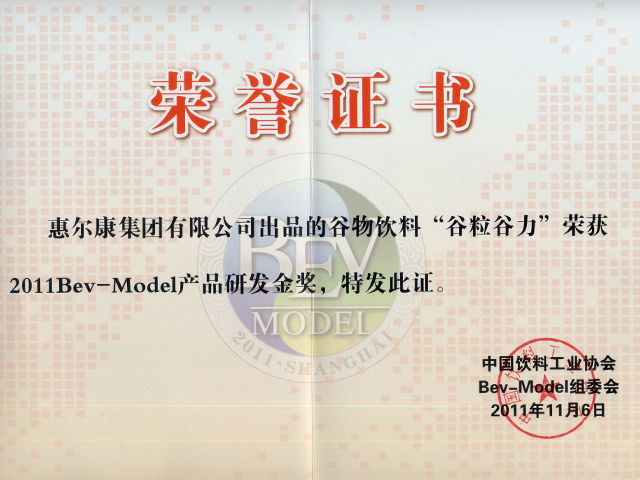 中國飲料工業(yè)協(xié)會授予谷粒谷力2011Bev-Model產品研發(fā)金獎