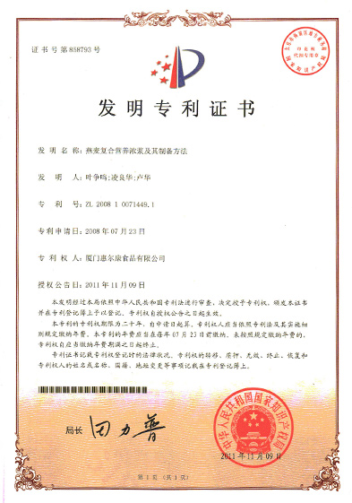 燕麥復(fù)合營養(yǎng)濃漿及其制備方法發(fā)明專利證書