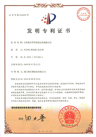 玉米復(fù)合營養(yǎng)濃漿及其制備方法發(fā)明專利證書