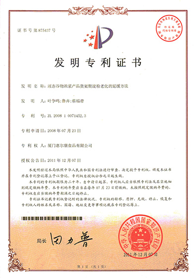 液態(tài)谷物濃漿產(chǎn)品貨架期淀粉老化的延緩方法發(fā)明專利證書