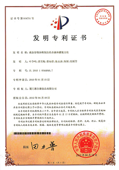 液態(tài)谷物雜糧制品的殺菌和灌裝方法發(fā)明專利證書